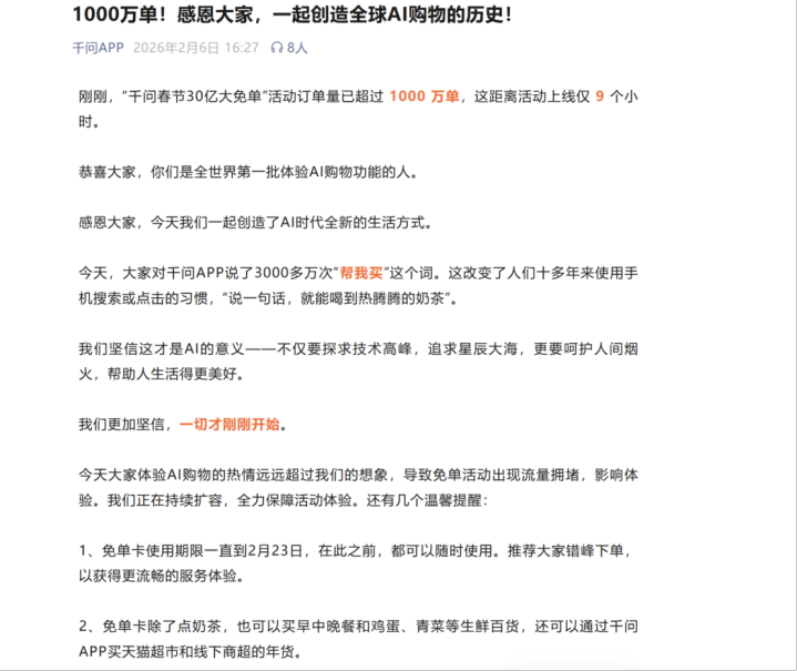 继腾讯元宝发放现金红包之后,阿里旗下的千问APP 于2月6日正式开启“春节30亿大免单”,把大模型能力直接推入奶茶、外卖等高频消费场景.