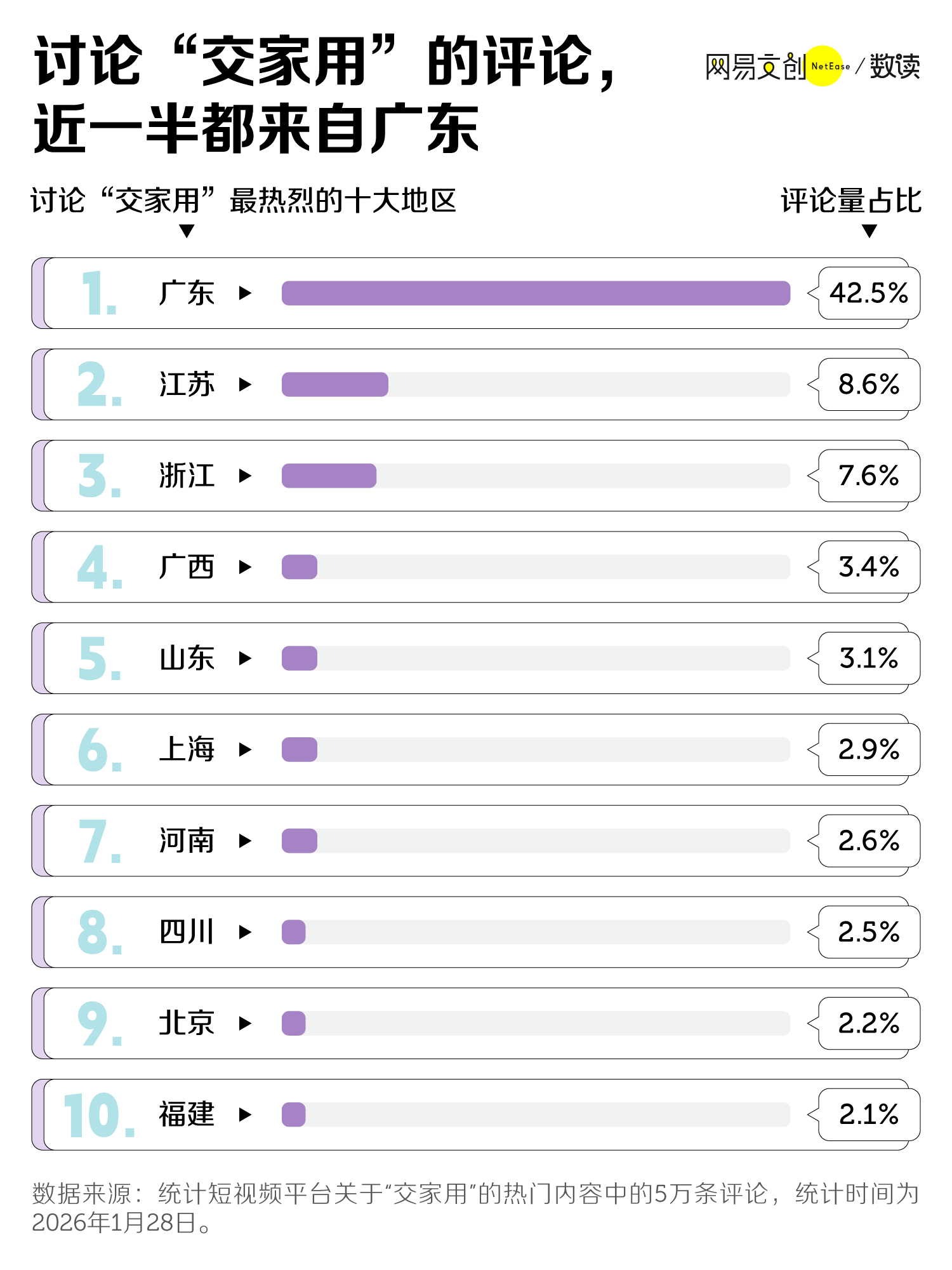 我们统计了某短视频平台关于“交家用”的近 5 万条评论,近一半评论都来自广东人,还有约五分之一来自江浙沪。北方人占少数,而且纷纷表示“活了这么久,第一次听家用这个词”。