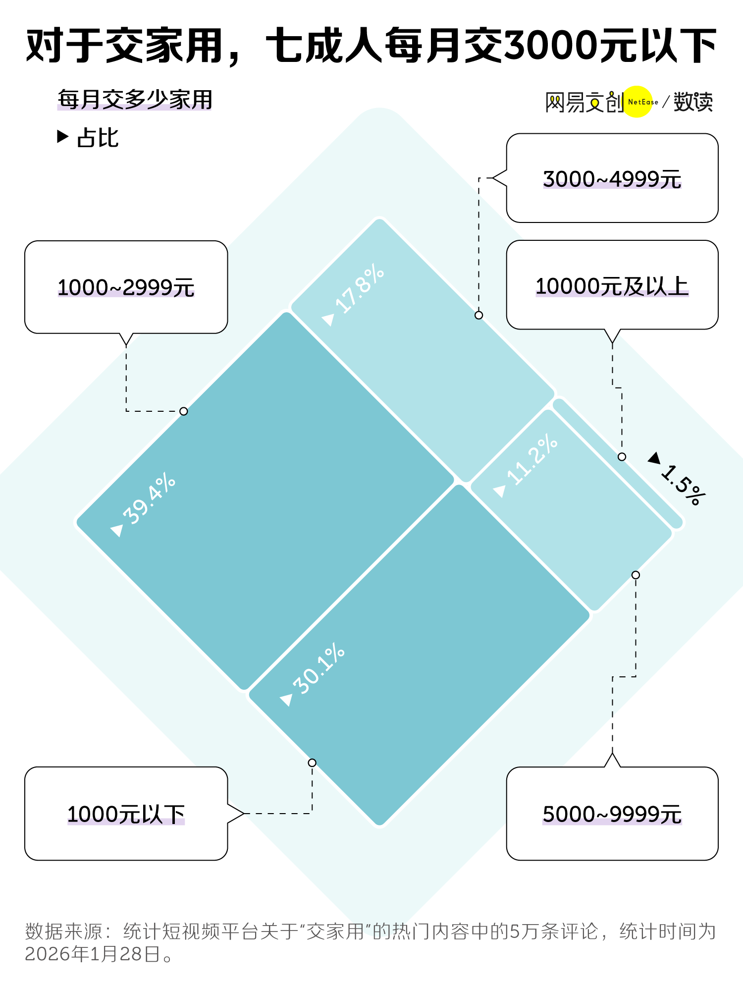 人们讨论的“家用”金额,每月交 5000 元以上的属于少数派,合计 12.7%,其中万元以上的“高额家用”仅占 1.5%。近七成还是在 3000 元以下,看似不多,但对月薪三千的人来说,也是一笔大钱。