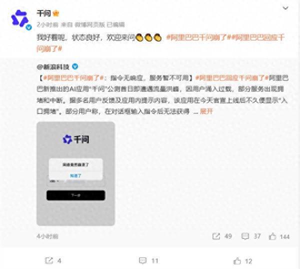 站长之家(ChinaZ.com)11月17日 消息:今天早间掌心策略,“阿里巴巴千问崩了”的相关话题迅速在微博上引发广泛关注,一度冲上热搜榜单。面对这一突发情况,千问官方微博迅速发文回应,以轻松幽默的语气表示:“我好着呢,状态良好,欢迎来问。”